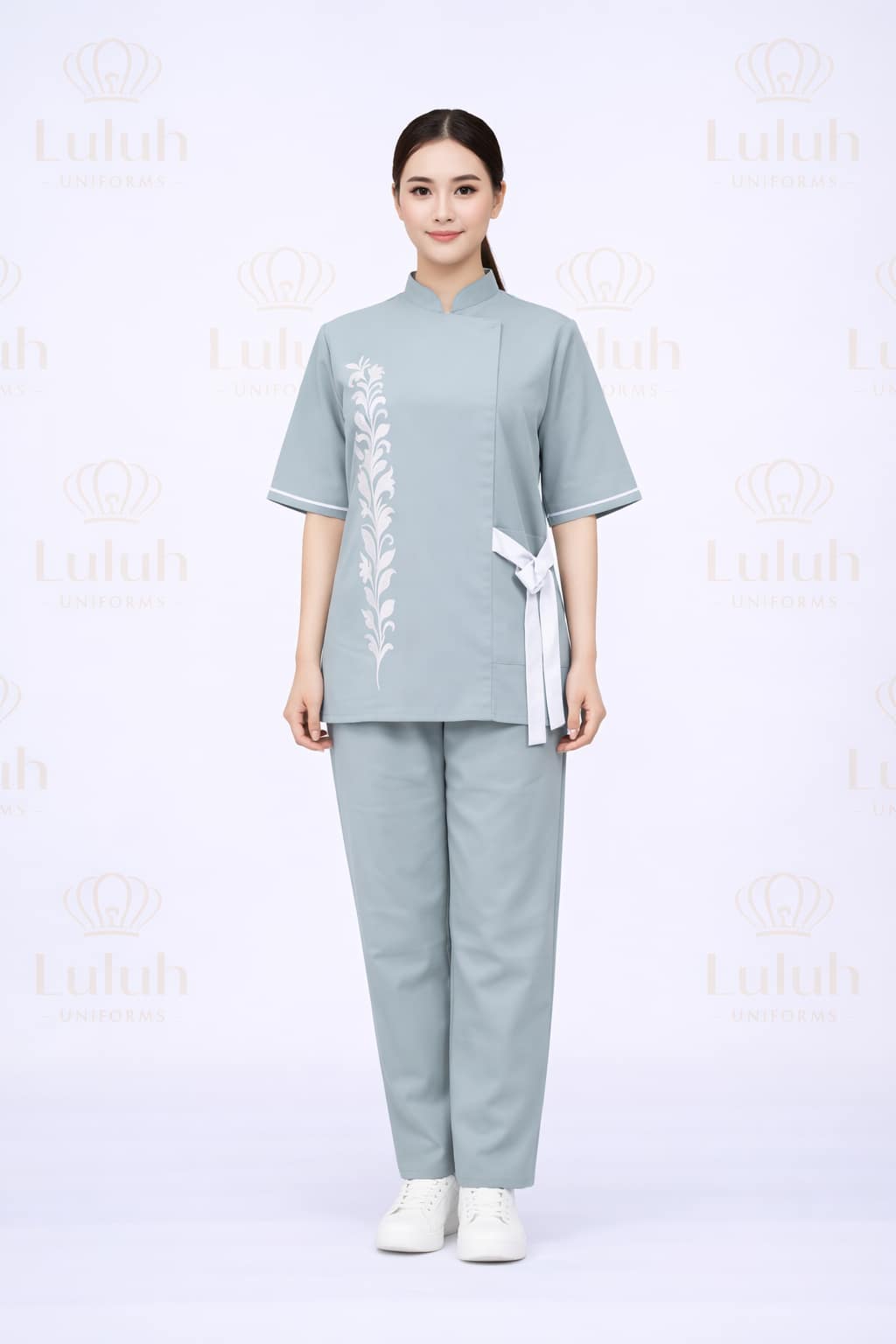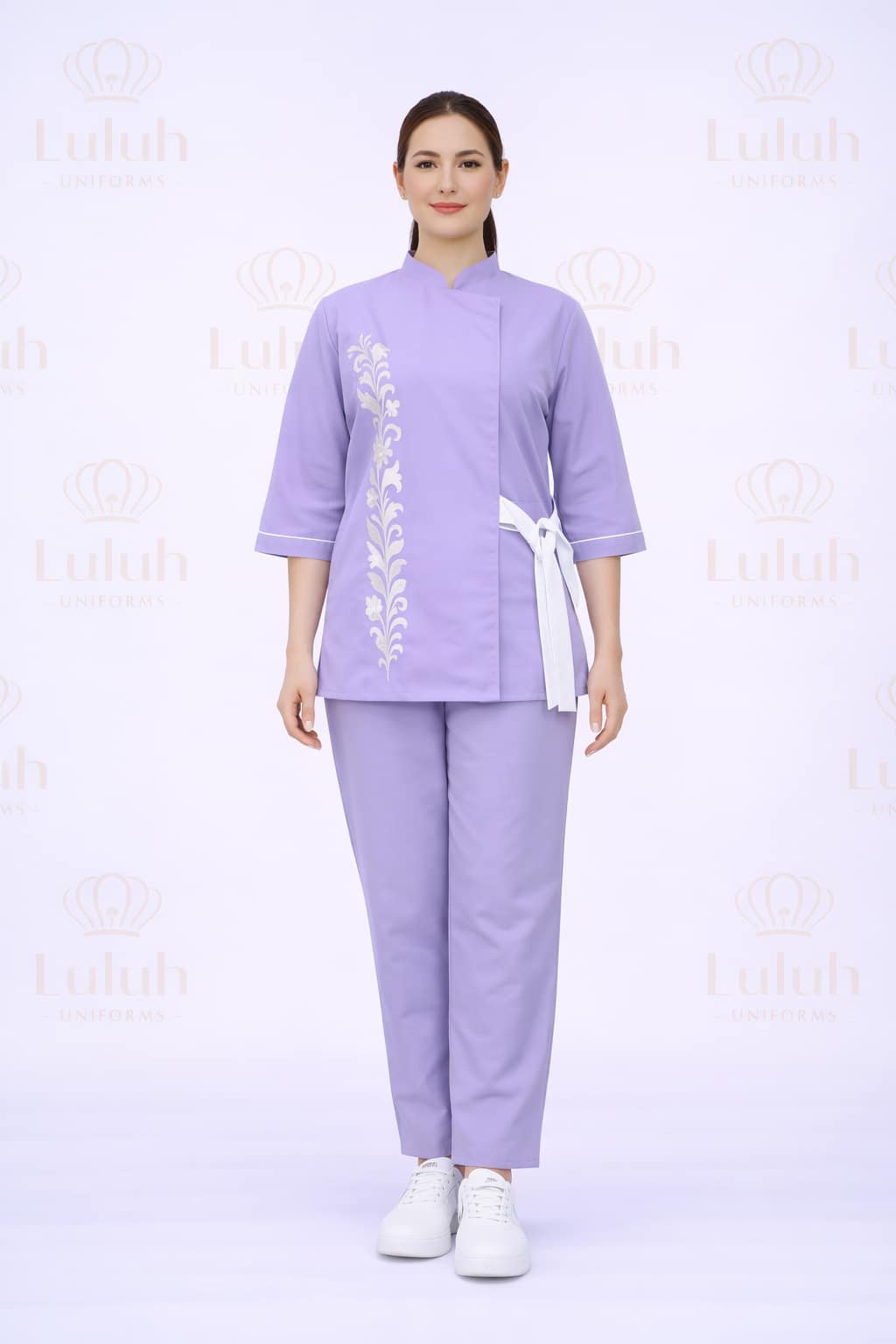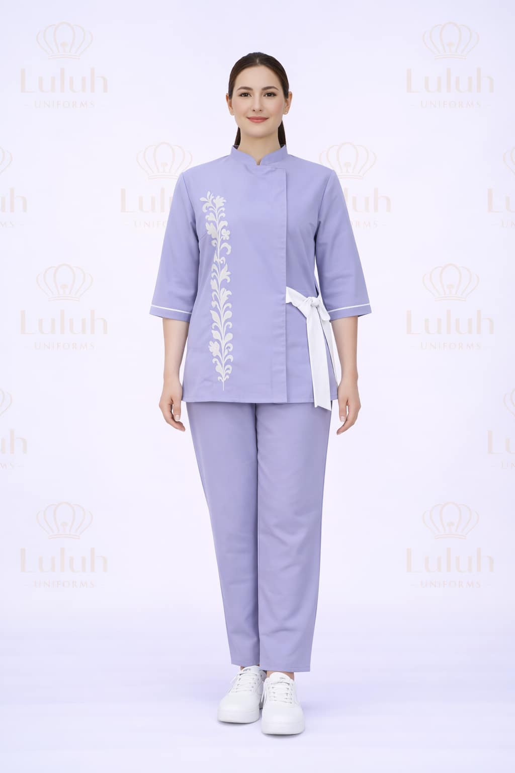 يونيفورم أنيق مخصص للعاملات في الضيافة والاستقبال، يجمع بين الفخامة والعملية ليعكس مظهرًا راقيًا واحترافيًا في بيئات العمل الرسمية.
